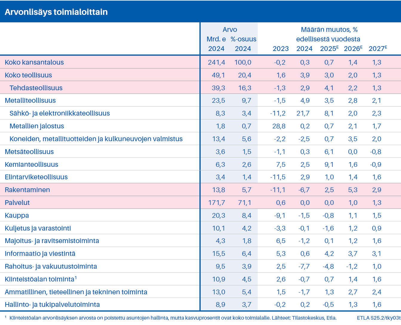 Etlan syyskuussa julkaiseman laajan suhdanne-ennusteen mukaan Suomen bkt kasvaa tänä vuonna 0,8 prosenttia ja ensi vuonna 1,4 prosenttia. Vuonna 2027 Etla ennustaa kasvun jatkuvan 1,2 prosentin vauhdissa. Tänään julkaistun toimialakohtaisen ennusteen mukaan lähivuosien talouskasvua kannattelevat erityisesti teollisuus ja rakentaminen. Suomen vientikysyntä vahvistuu, mikä tukee teollisuuden näkymiä.